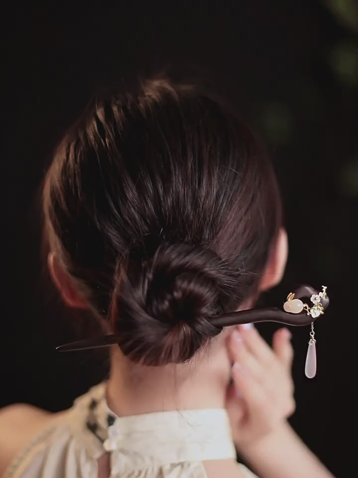 A charming fusion of sandalwood and jade. Handcrafted for elegance and adorned with a cute jade bunny, it's the perfect accessory to elevate any hairstyle with a touch of natural allure.
